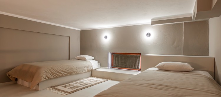Στο πρώτο επίπεδο θα βρείτε έναν ευρύχωρο ενιαίο χώρο με άνετο διπλό κρεβάτι, και καθιστικό με τζάκι. Το πατάρι φιλοξενεί δύο ακόμα μονά κρεβάτια σε έναν ήσυχο χώρο, ιδανικό για παιδιά.