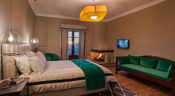 Distinctive shades, high-quality fabrics, and handcrafted lighting fixtures create a sense of luxury, while the fireplace offers the perfect coziness for the cold nights of Arachova.
